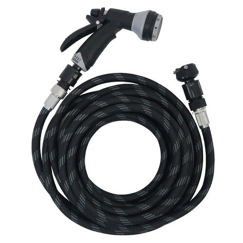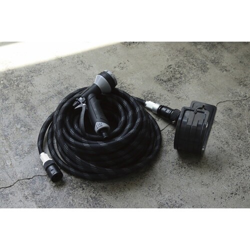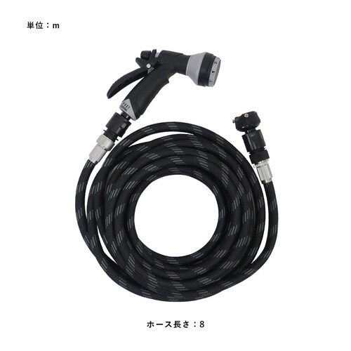 10種類の水流で様々な用途に使えるガーデンホース 8mです。 ストッパー付きで長時間レバーを握ることによる手の疲れも軽減できます。 長いホースをしっかりとまとめて収納できる、ホースハンガー付きです。 |