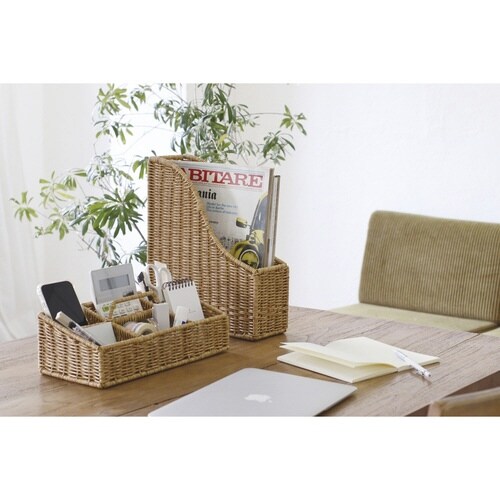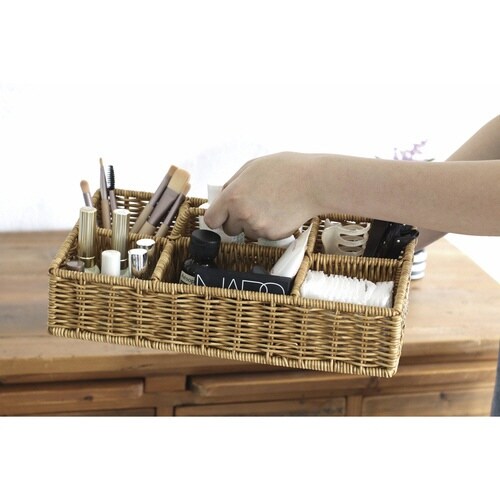 持ち運びに便利な持ち手付き収納ボックスです。 ボックス内は6つのスペースに仕切られています。 汚れたら水洗いできます。 天然素材で編まれたような自然な温かみを感じる風合いです。 |