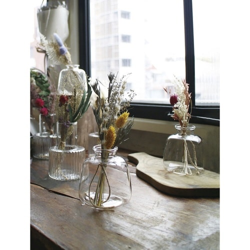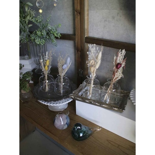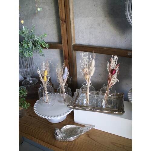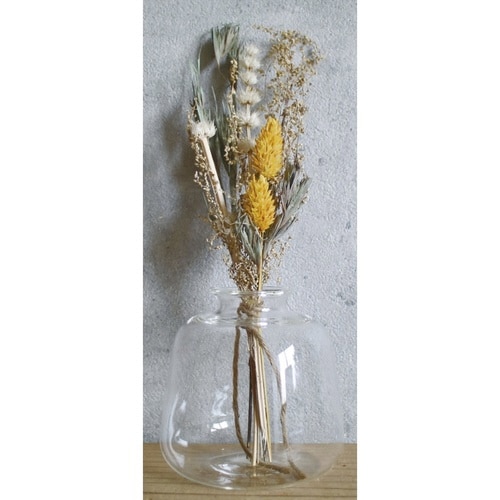 天然の花を丁寧に乾燥させた美しいドライフラワーと、シンプルなガラスベースのセットです。 そのまま置くだけで、さりげなく空間に華を添えます。 |