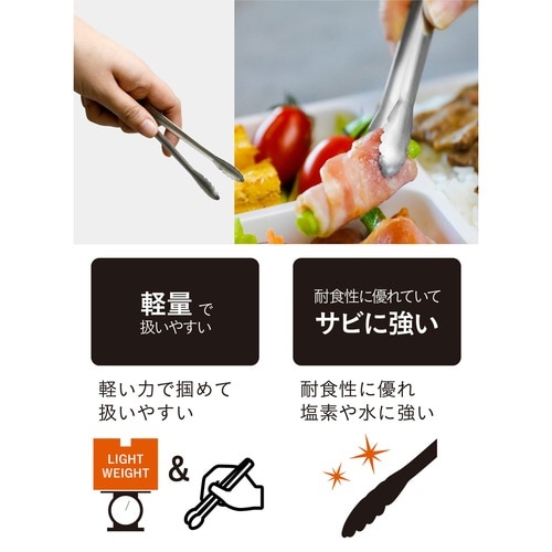 調理時間をより快適に、長く使える日本製のトングです。 小さくて掴みにくい食材の盛り付けに便利です。 一般的なステンレス素材の約2倍の強度があります。 |