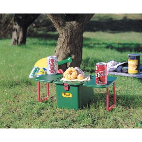 クーラーボックスが便利なテーブルになります。 脚をテーブルの裏にコンパクトに収納できます。 350mlの缶が縦に6本収納できます。 |