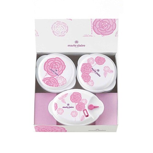 マリ・クレールのローズブルーミング電子レンジ容器3個セット(小判型310ml×1個、丸型270ml×2個)です。 蓋をしたまま電子レンジにかけられるのでラップいらずの保存容器です。 |