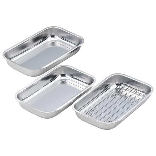 料理の下ごしらえに便利なステンレス製のバットとアミの4点セットです。 どんなキッチンでも使いやすいコンパクトサイズです。 フチを重ねて連結できるので、食材を移動させるときにキッチンを汚しにくいです。 |