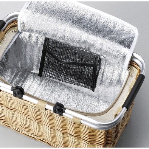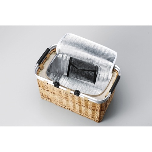使いどころを選ばないナチュラルなデザイン 手に持った時のサイズ感 メッシュポケット付き 内側はアルミ+ビニールの二重構造 軽くて持ちやすい、アルミ製ハンドル付き |