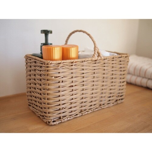天然素材風のフェイク素材を使用したフェイクラタンバスケットです。 ポリエチレン素材の為、サッと水洗いが可能です。 フェイク素材なので、丈夫で壊れにくいです。 水に強いので、水まわりでの使用も可能です。 |