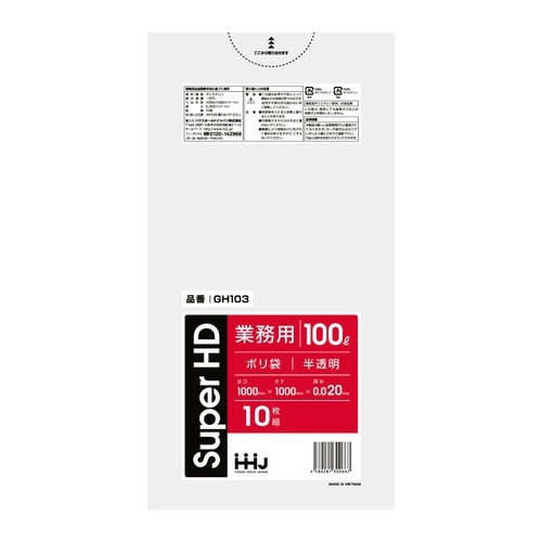 ハウスホールド ゴミ袋 100L 100×100cm 厚さ0.02mm 10枚入 半透明 GH103 ※10個以上から注文可能(販売価格は1個単位の価格) 9293-2432
