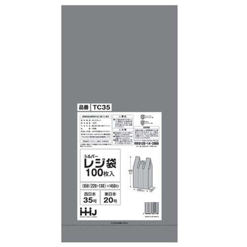 レジ袋 45x22cm マチ13cm 厚さ0.02mm 100枚入り 西日本35号 東日本20号 取っ手付き シルバー ※6個以上から注文可能(販売価格は1個単位の価格)