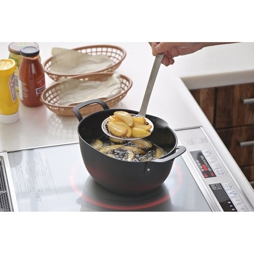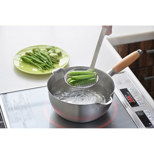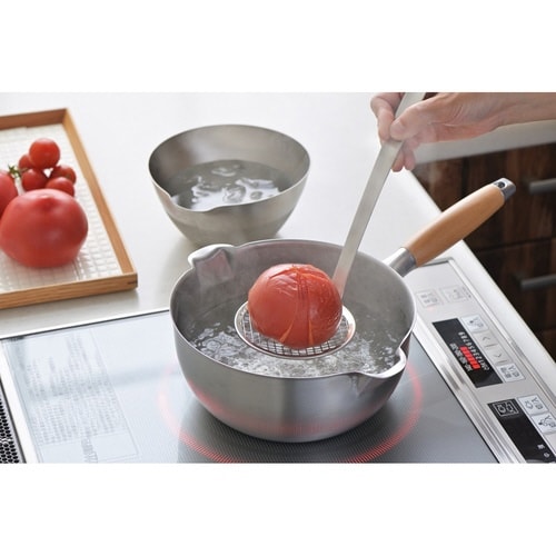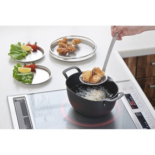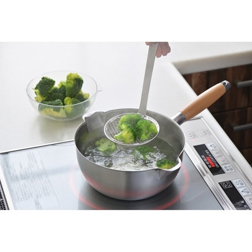 「ゆでる」「揚げる」などの調理に便利な湯切れ、油切りのよいメッシュタイプのすくい網です。 長めのハンドルなので、揚げ物をすくう時も手が熱くなりにくく、安心してお使いいただけます。 |