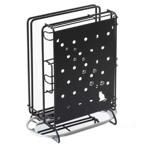 包丁、まな板、キッチンばさみをひとまとめに収納できます。 ネコの足跡シルエットのプレートが包丁の刃先をオシャレに目隠しします。 水受けトレー付きで、本体前面のプレートとトレーは取り外して洗えます。 |