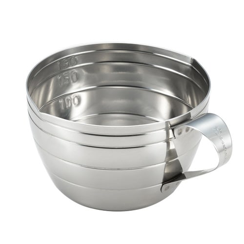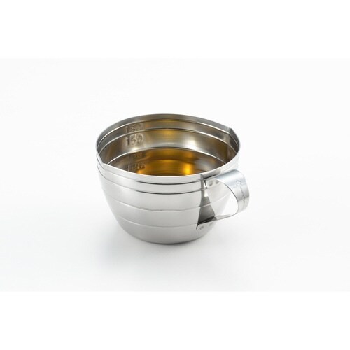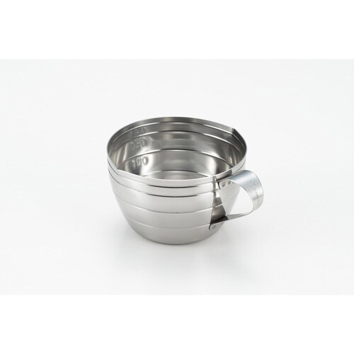 耐久性・耐食性に優れた18−8ステンレス製の計量カップ(200ml)です。 全周しているボーダーの計量線で、どこから見ても量りやすいのが特徴です。 金属加工の産地、新潟県燕三条で製造されています。 |