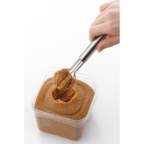 二人分のお味噌が一度に取れる味噌マドラーです。 そのままお鍋に入れてゆっくりと振ってお味噌を溶かせます。 毎日のお味噌汁の味付けが簡単に決まります。 耐久性に優れたオールステンレス製です。 |