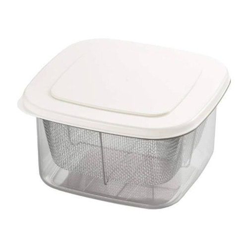 保存はもちろん、ザル付きなので水切りにも使える便利な容器です。 ザルを外せばフタをしたまま電子レンジ使用可能です。 冷蔵庫内のスペースを有効に使える角型です。 |