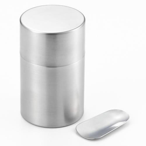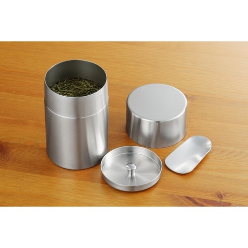 上品ですっきりしたデザインの茶筒です。 オールステンレスなのでお手入れしやすくなっています。 お茶をより楽しむアイテム茶箕(茶さじ)付きです。 |
