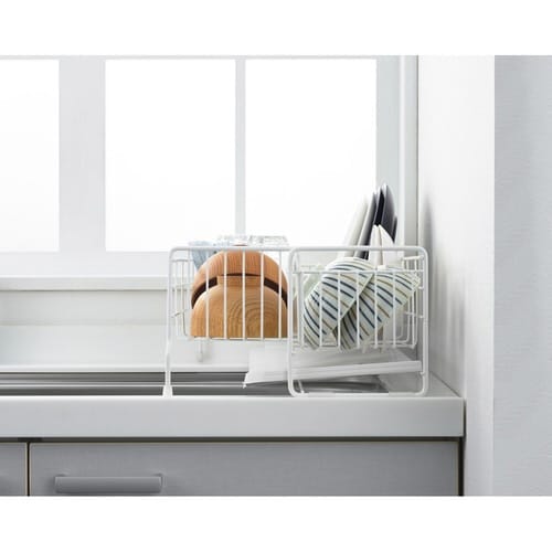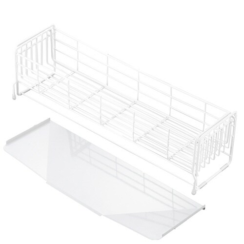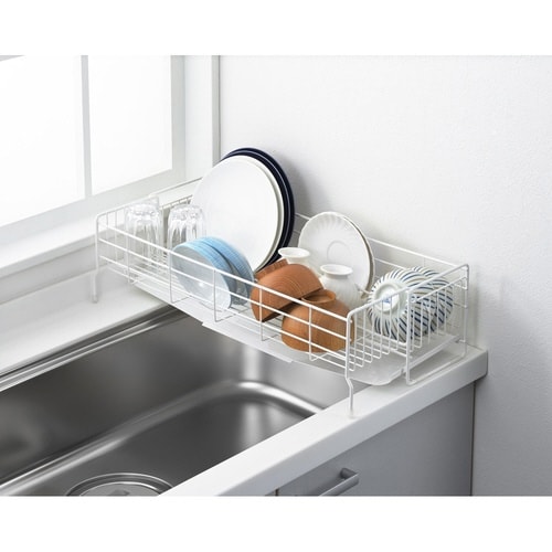 清潔に使える抗菌塗装された幅の広がる水切りです。 スライド式で洗い物の量に合わせて幅を広げられます。 斜めになったトレーは水がシンクに直接流れていきます。 |