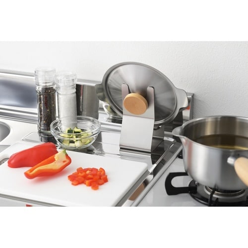 鍋フタや、フライパンのフタを立て掛けて置けるスタンドです。 調理中のフタの一時置きに便利です。 コンパクトサイズなので、使いたい位置に置けて作業台の上で邪魔になりにくく、狭いキッチンでも活躍します。 |