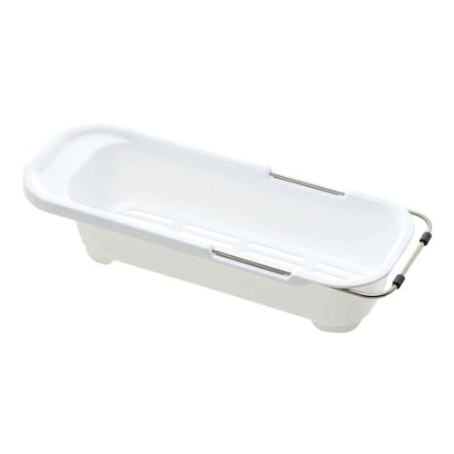 キッチンに合わせてシンクスペースを有効活用できる伸縮タイプの水切りです。 奥行40cmから50cmのシンクに対応しています。 底面は水切れしやすい形状になっています。 |
