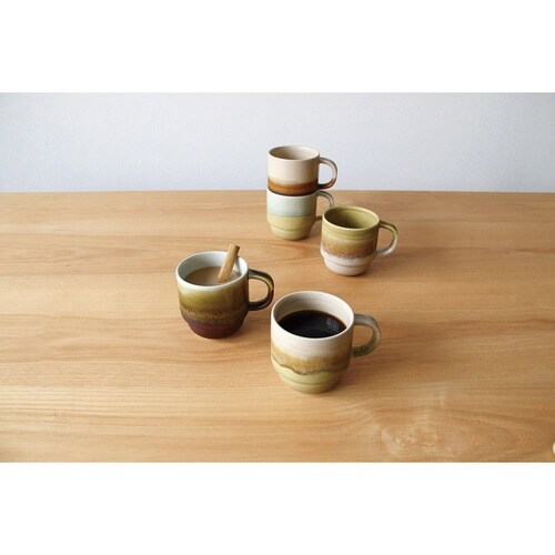 ひとつひとつ手作業で丁寧に作られたマグカップです。 釉薬の濃淡を地層に例えた個性的なデザインです。 同じデザインがひとつとしてないので釉薬の表情の違いを楽しめます。 |