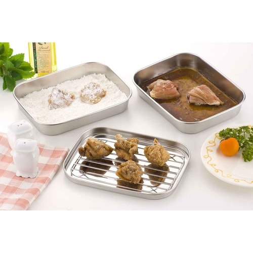 揚げ物調理をサポートする便利なステンレス製のバットのセットです。 バットの中に小麦粉、卵、パン粉を分けて使用するとスムーズに揚げ物調理が出来ます。 |