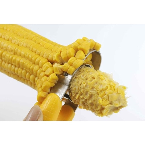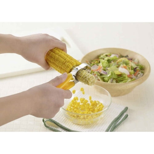 とうもろこしの実が芯からきれいに取れます。 とうもろこしの先にカッターの刃を当て、ねじり回すように押し出すだけの簡単操作です。 コーンの粒を使って幅広いメニューをお楽しみいただけます。 |