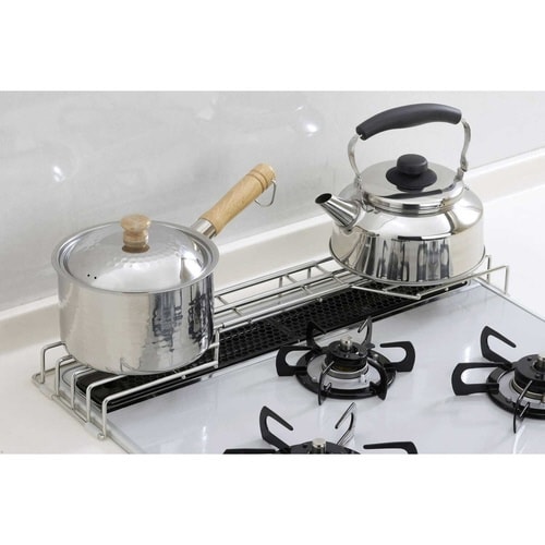コンロ奥の隙間スペースを有効活用できる60cm幅コンロ用のラックです。 熱にも強く、しっかりとした耐荷重で調理中の鍋やフライパンの一時置きにもとても便利です。 |