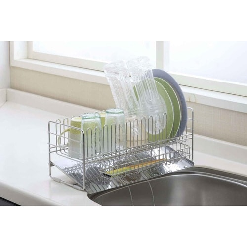 置き場所に困らないコンパクトな水切りバスケットです。 狭いキッチンにも置けて、食洗機のサブとしても便利に使えます。 本体の枠組みをU字にすることで大皿もきっちり収まり、垂直に立てられ水切れ抜群です。 |