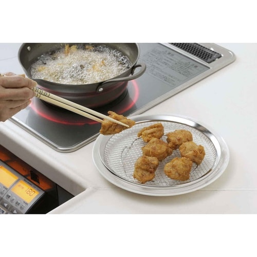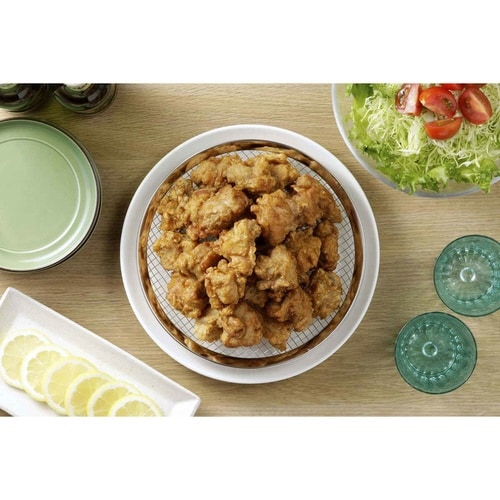 揚げ物のカラッとした食感を保つ大きめサイズの油切り皿です。 油切り皿により食材とお皿に空間が出来て余分な油が落ち、出来たての食感を保ちます。 |