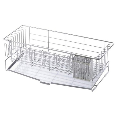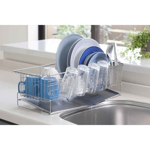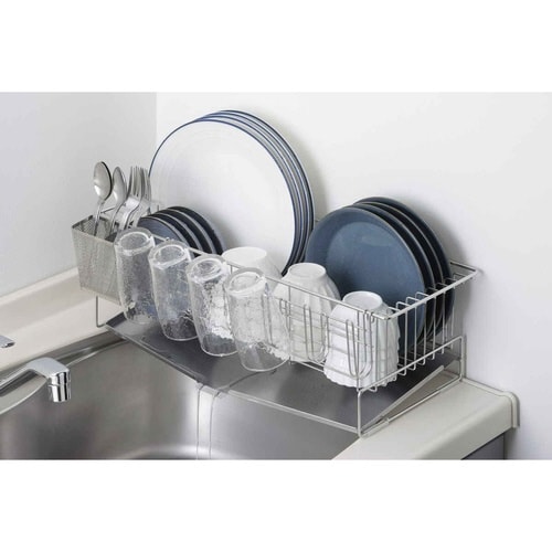 シンク脇の狭いスペースにピッタリ置ける水切りラックです。 バスケットの両サイドに皿が立てられるツバ付でお皿が倒れず、隣の皿と干渉しにくいので乾きやすいです。 |