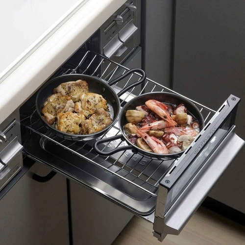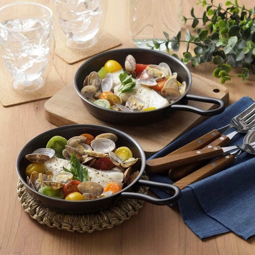魚焼きグリルで使える便利なスキレットです。 グリルは余熱時間が無いので時短調理できます。 食材のうまみや水分をぎゅっと閉じ込めます。 魚焼きグリルに2個入るコンパクトサイズです。 |