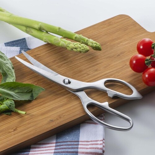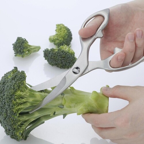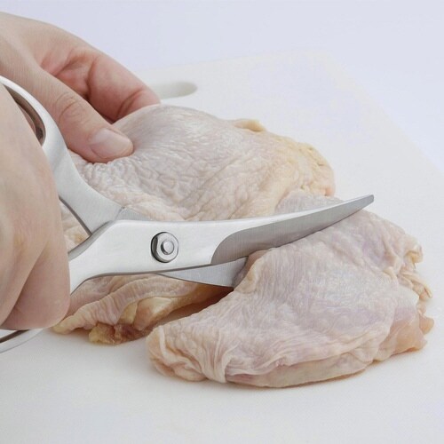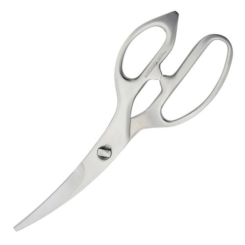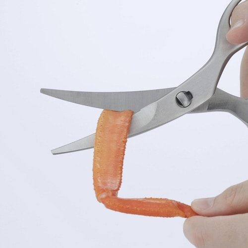 お手入れしやすいオールステンレス製のキッチンばさみです。 刃がゆるやかにカーブしているので、下からすくうように刃先を入れて切りやすいです。 滑らずに食材をしっかりつかむギザ刃形状です。 |