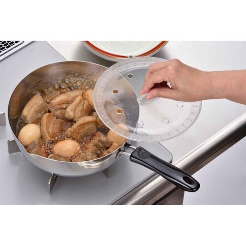 透明なので蓋を持ち上げずに煮込み具合を確認できます。 中央部にはつまんで取れるフック付きです。 本体の外周にはアクを程よく取れるシボ(凹凸)加工を施しています。 食洗機対応でお手入れが簡単です。 |