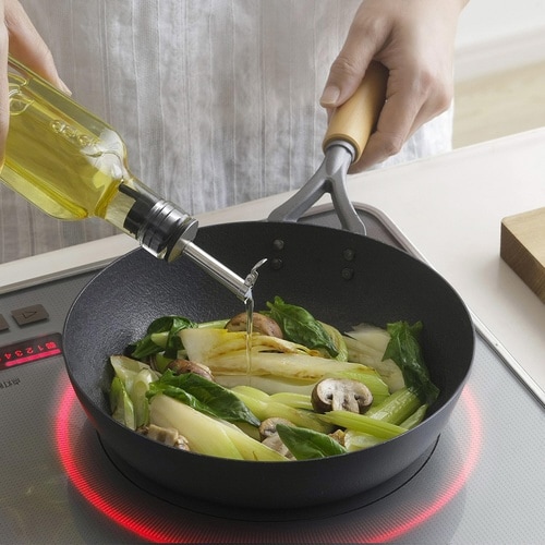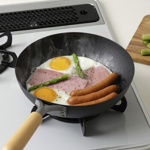 表面に凹凸を付けるファイバーエンボス加工で食材がくっつきにくいです。 鉄は蓄熱性に優れており、食材にムラなく熱が通ります。 朝食やお弁当作りにちょうどいい22cmサイズです。 |