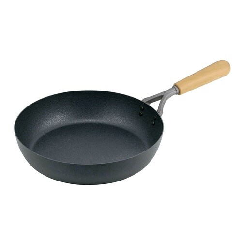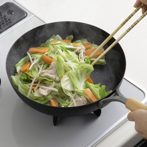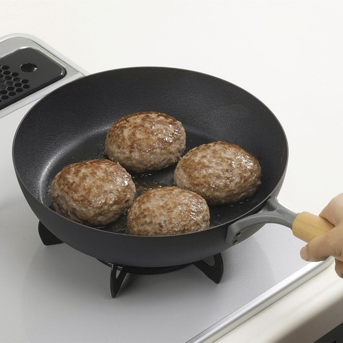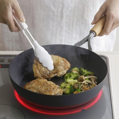 表面に凹凸を付けるファイバーエンボス加工で食材がくっつきにくいです。 鉄は蓄熱性に優れており、食材にムラなく熱が通ります。 大きすぎず小さすぎない、マルチに使える26cmサイズです。 |