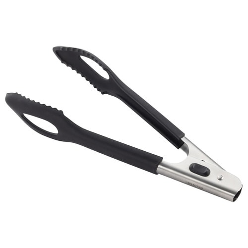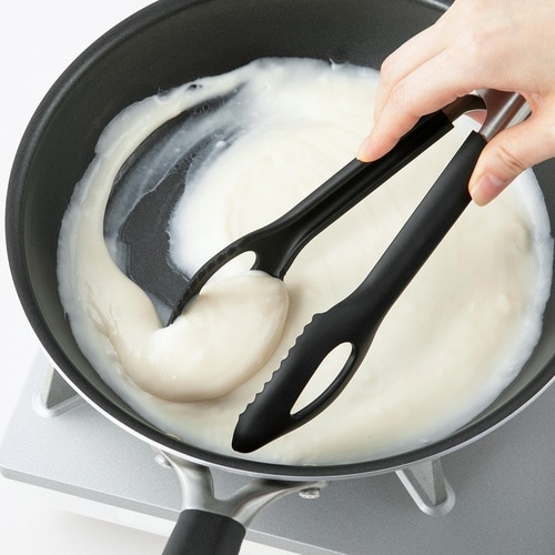 コーティングフライパンを傷つけない、安心のシリコーン製のトングです。 揚げ物から炒め物、麺類の茹で作業まで幅広く使えます。 穴あき形状なので、食材を掴むと同時に、水切り・油切りができます。 |