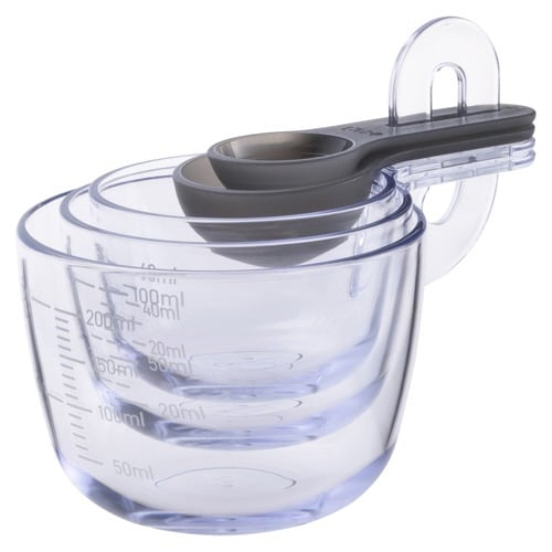 重ねてコンパクトに収納できる大さじ1、小さじ1の計量スプーンと、60ml、100ml、200mlの計量カップのセットです。 |