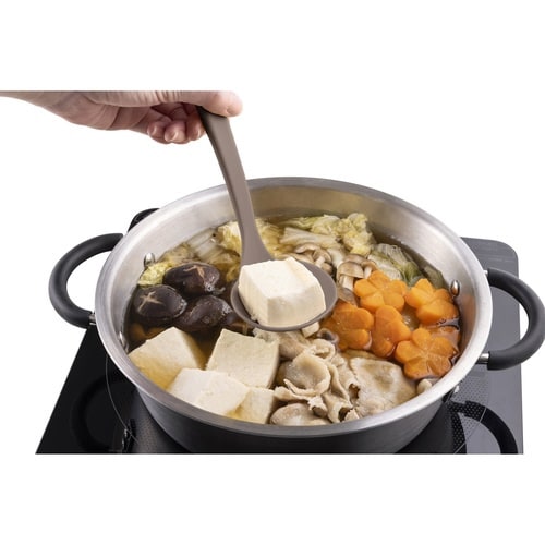 ナイロン製なので、お鍋やフライパンを直接傷つけません。 小さめサイズで、卓上でもかさばることなく使えます。 鍋のフチにかけられるフック付きです。 継ぎ目の無い一体型で汚れがたまりにくく衛生的です。 |