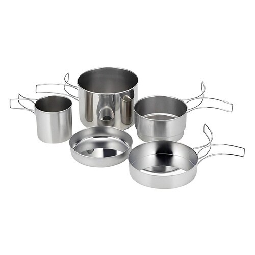 ステンレス製のクッカー5点セットです。 災害時の備えにもおすすめです。 ハンドルを折りたたんでスタッキング可能です。 キャンプや登山にコンパクトに持ち運べて便利です。 安心の日本製です。 |