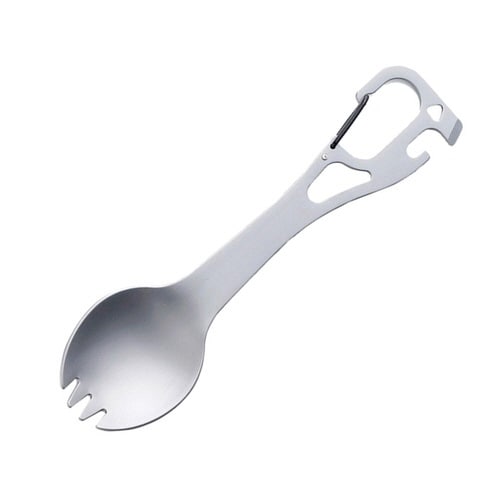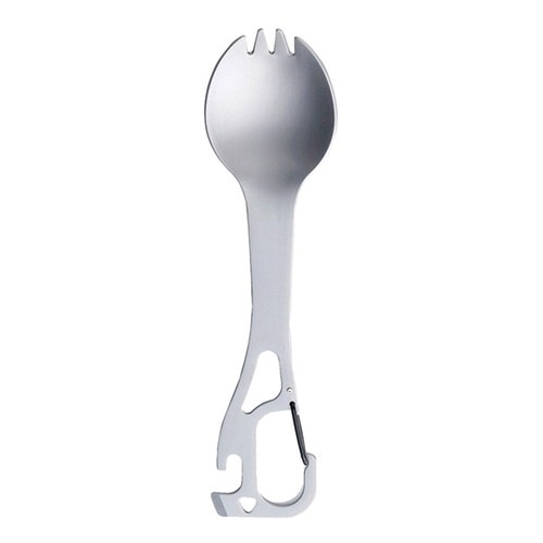先がフォークのように割れたスプーンに、栓抜と缶切の機能が付いています。 ステンレス製なので錆びにくく軽くて丈夫なつくりです。 カラビナが付いているので吊り下げて持ち運ぶことができます。 |