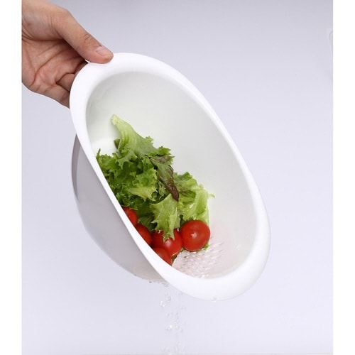 ボウルとザルがひとつになりました。 傾けて置くことができるので、片側でボウル、片側でザルと使い分けいただけます。 水を切った後も傾けるだけで水滴がしたたりません。 |