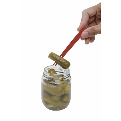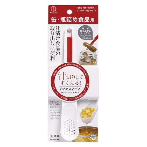コーンや豆など、缶詰や瓶入りの食材を汁切りしてすくえる、穴あきスプーンです。 長めなので細長い瓶などから食材を取り出しやすいです。 柄にセットされた赤色のピック付きです。 |