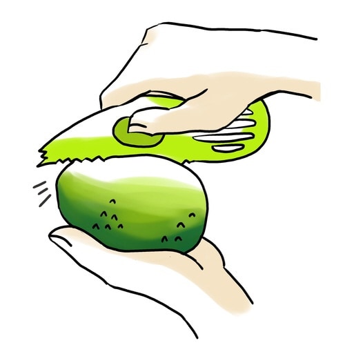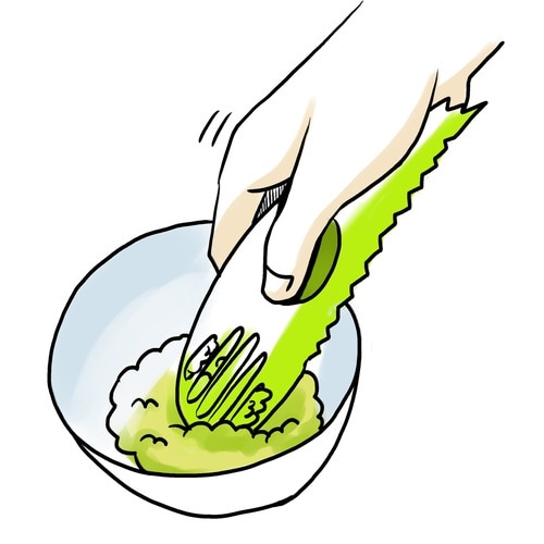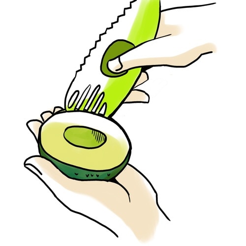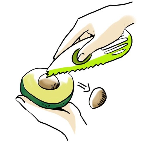 切りにくいアボカドを、切る、種を取る、実をすくう、つぶす、の4刀流ですばやく調理できる「アボカドカッター」です。 しっかりにぎれる指ポケット付きです。 アボカドの形を模したプラスチック製です。 |