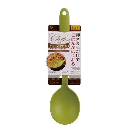 フライパンを傷つけにくいナイロン製のチャーハンお玉です。 平たいスプーン形状なので、押さえるだけで簡単にご飯をほぐせます。 フライパンにすべり落ちないストッパー付きです。 |