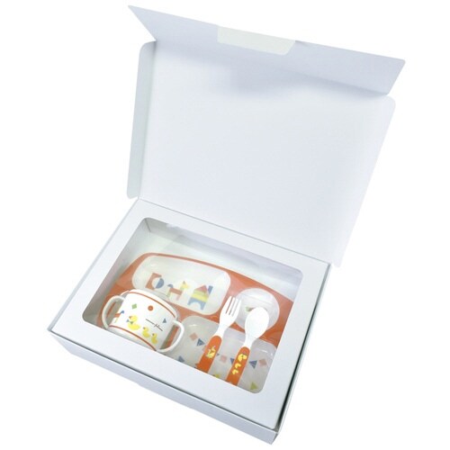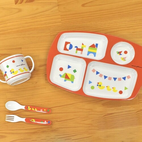 子どもの関心を引き寄せる「積み木」デザインの食器セットです。 プレート、コップ、スプーン&フォークがセットになっています。 |