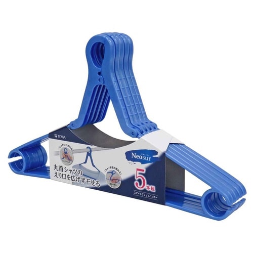 丸首シャツのえり口を広げず干せる、スマートグリップハンガー5本組です。 ハンガーの肩部を握るとキャッチ部が倒れるので、丸首シャツもラクに干せます。 |