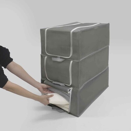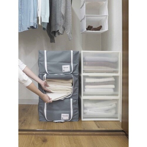 フレーム付き衣類収納袋 『ロングサイズ』です。 未使用時はコンパクトに折りたためて、隙間に収納できます。 「フレーム+生地」だから軽くて洋服を入れても持ち運びが楽です。 |