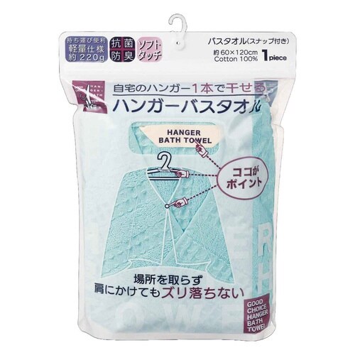 ハンガー1本で干すことができるハンガーバスタオル 60×120cmです。 タグとスナップを使って、ハンガーに掛けてもずり落ちず、簡単に干すことができます。 約220gと軽量仕様で持ち運びにも便利です。 |
