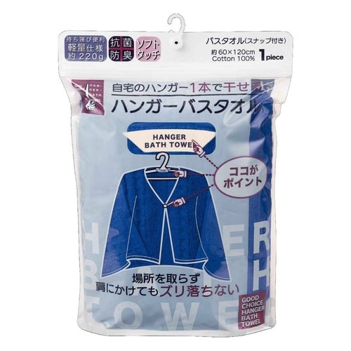 ハンガー1本で干すことができるハンガーバスタオル 60×120cmです。 タグとスナップを使って、ハンガーに掛けてもずり落ちず、簡単に干すことができます。 約220gと軽量仕様で持ち運びにも便利です。 |