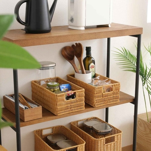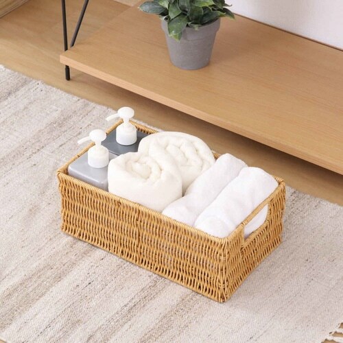 天然素材で編まれたような自然な温かみを感じるバスケットです。 汚れたら水洗いできます。 小物入れに最適なサイズです。 キッチン、リビングなど、さまざまな場所の収納に役立ちます。