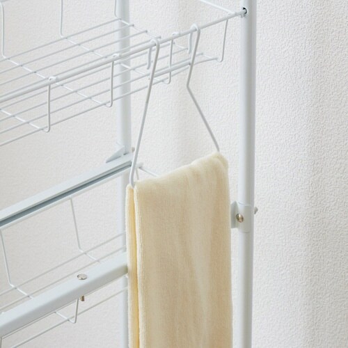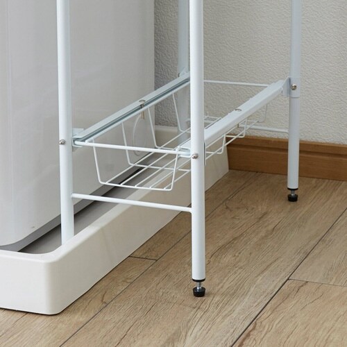 洗濯機横のスペースを有効活用 防水パンをまたいで設置可能 小物を置くのにぴったりな上段 下2段は引き出し式で取り出しやすい 引き出しはストッパー付きで抜け落ちない |