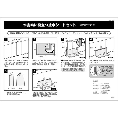 水害時に役立つ止水シートセットです。 必要な物がまとめてそろったセットなので、いざという時にすぐにお使いいただけます。 自動ドアやシャッターの隙間からの浸水を防ぎます。 |