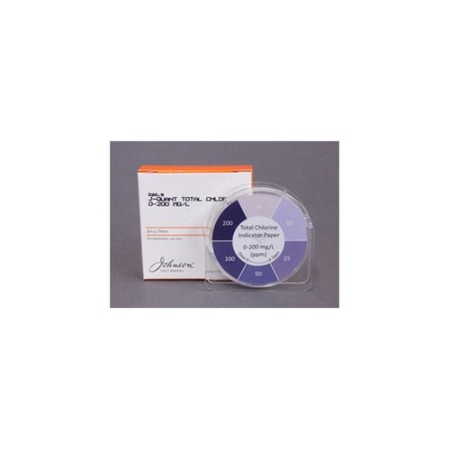 サンプル溶液中の塩素(Cl2)、次亜塩素酸(HClO)、次亜塩素酸イオン(ClO−)の半定量測定を行います。これらと反応すると白色試験紙は紫色に変色します。 |